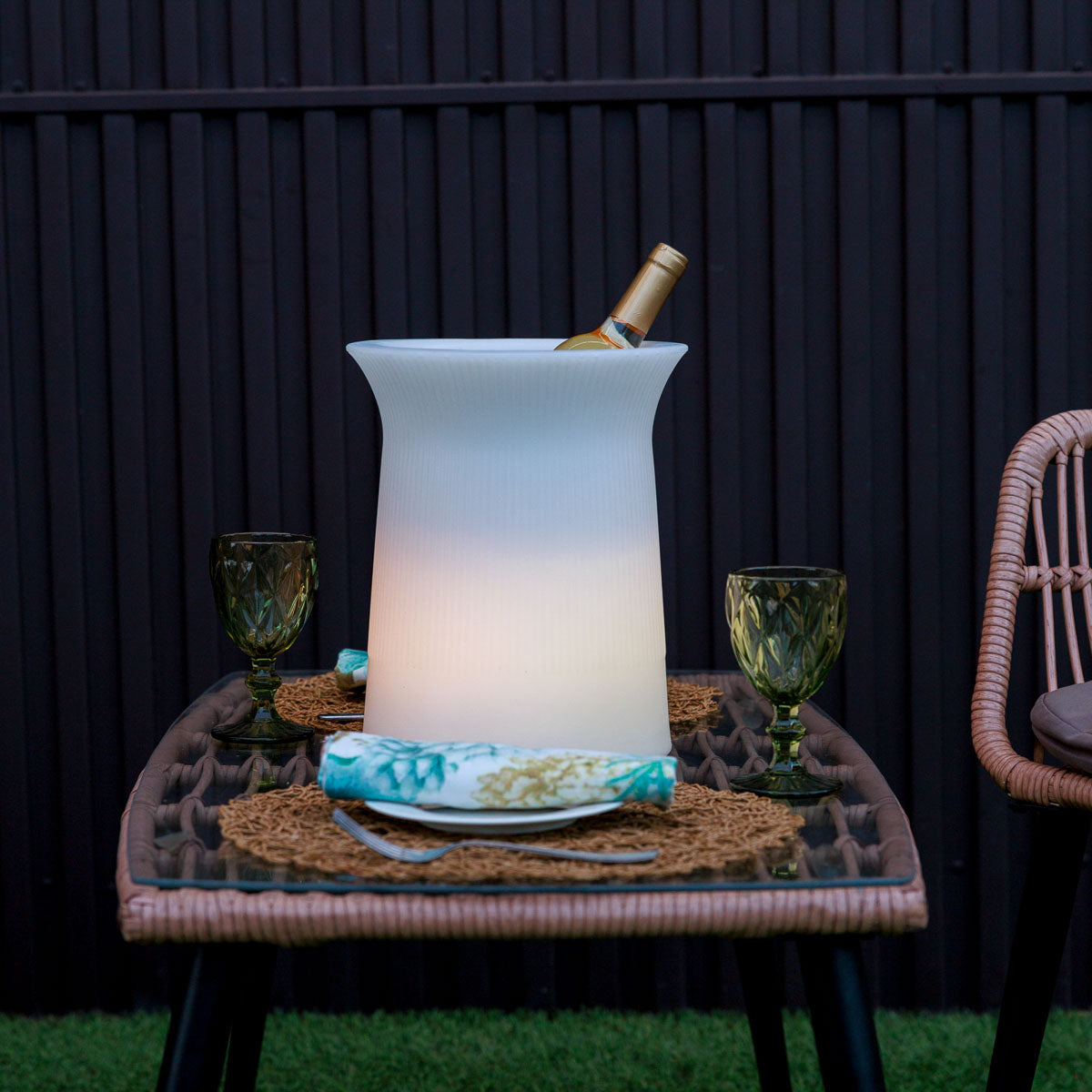 Equipada con luces RGB y luz blanco, esta cubitera te permite seleccionar entre una variedad de colores vibrantes para adaptarse a cualquier ocasión o ambiente. Su construcción de polietileno garantiza durabilidad y resistencia. Perfecta para fiestas, eventos al aire libre o simplemente para añadir un toque a tu hogar, esta cubitera LED es tanto funcional como estéticamente atractiva.