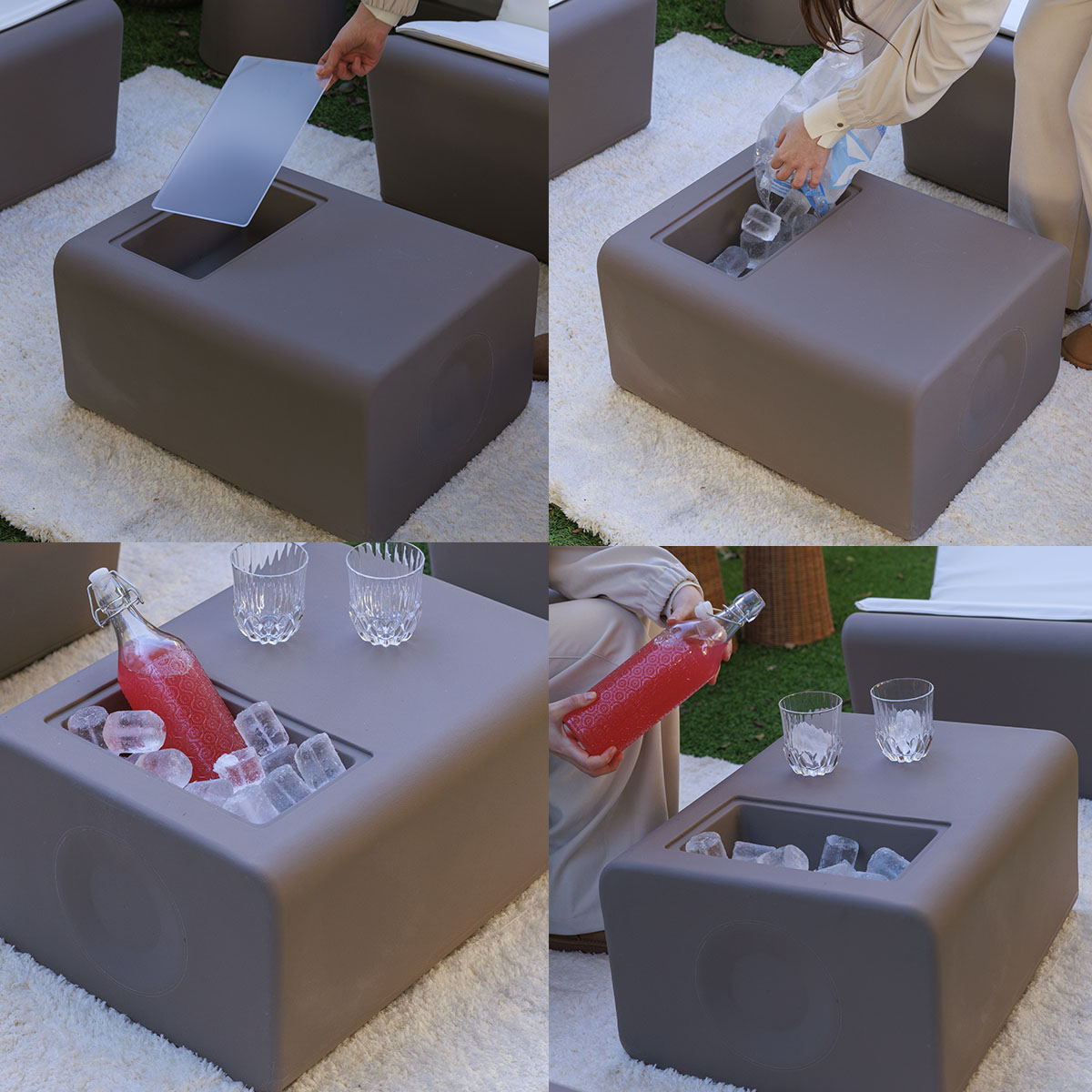 TARIDA TAB: Rechthoekige salontafel uit de TARIDA-collectie. Het heeft een holte in het oppervlak, waardoor het gebruikt kan worden als flessenrek, bloempothouder, tijdschriftenrek, etc. Het bevat ook een methacrylaatplaat om een groter oppervlak aan de onderkant te creëren. Dankzij de afwerking met ZONNE-ENERGIE + OPLAADBARE BATTERIJ hebt u geen last meer van kabels!