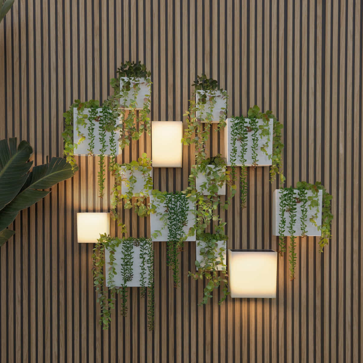 Transformeer elke muur in een unieke decoratieve compositie met het WALLY-pakket, een oplossing die slimme zonverlichting en verticale tuinen in één concept combineert.